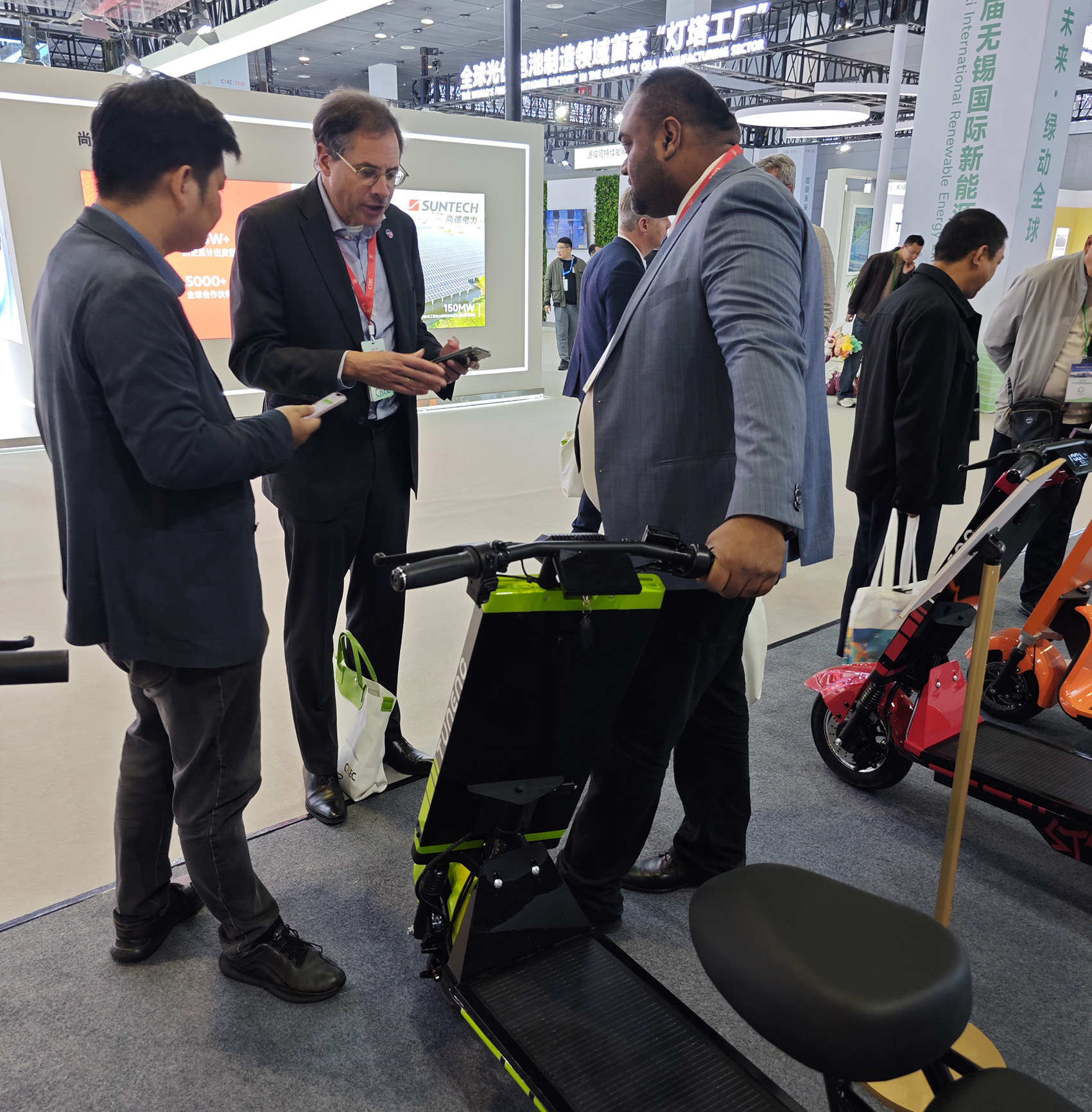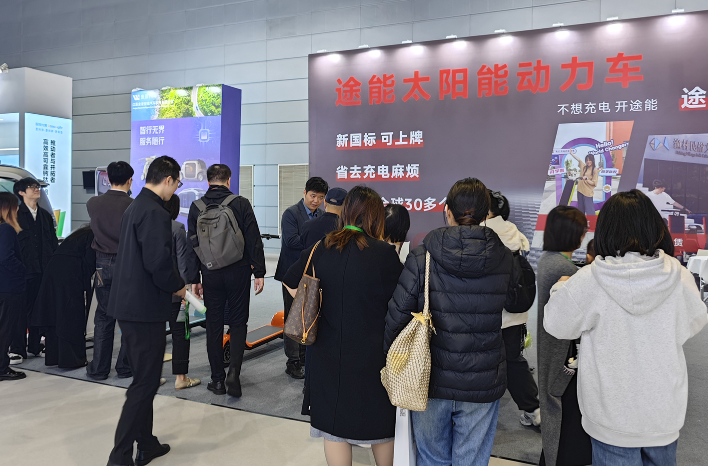 11 月 13 日,无锡新能源展在太湖国际博览中心开幕首日,A1 馆 151 展位的途能太阳能新国标电动车便迎来火爆人气,一早便吸引大批客户驻足试骑,现场咨询不断。